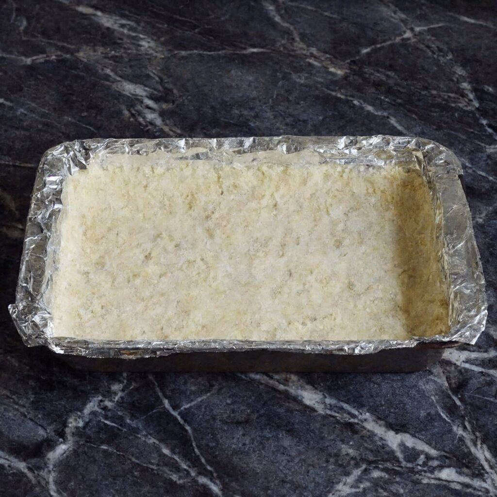 Press the mixture firmly and evenly into the bottom of the prepared pan. Use the bottom of a measuring cup or glass to press it down firmly—this ensures the crust holds together after baking.