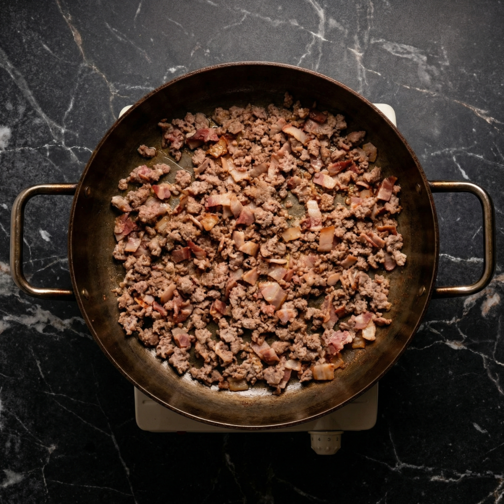 The pancetta adds a savory, smoky base while the aromatics create depth in the sauce.