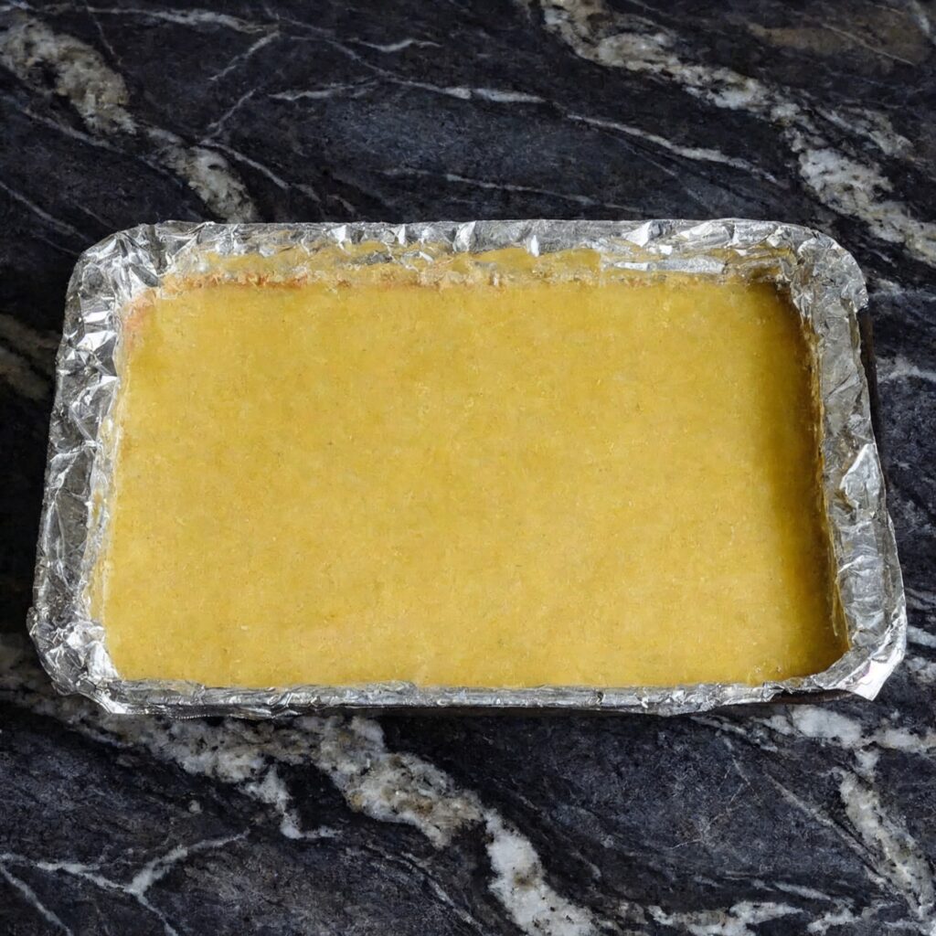 Press the mixture firmly and evenly into the bottom of the prepared pan. Use the bottom of a measuring cup or glass to press it down firmly—this ensures the crust holds together after baking.